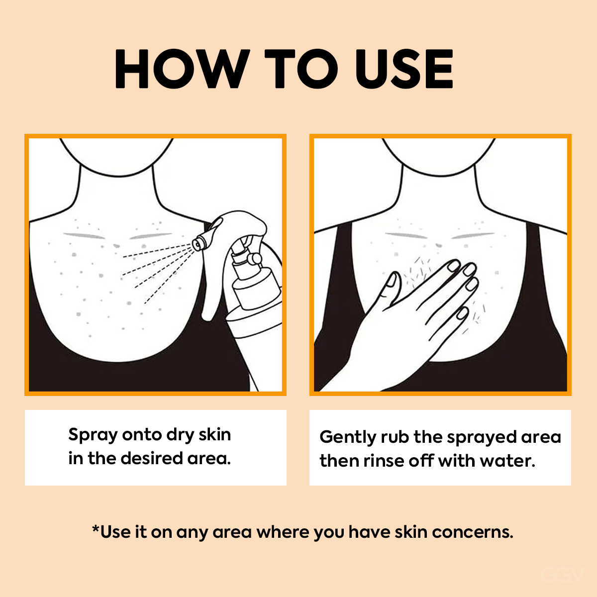 Step 1:Spray the product onto dry skin in the area where you want to address skin concerns, such as the back, elbows, chest, underarms, shoulders, or buttocks.